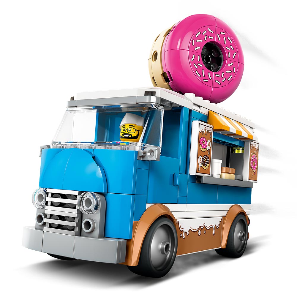 Te presentamos el vehículo de juguete definitivo para los golosos a partir de 5 años. El juego LEGO® City Camión de Dónuts (60452) lleva una gustosa decoración de glaseado, un enorme dónut en el techo y una zona de preparación accesible con máquina de café y caja registradora. Los niños pueden vender deliciosos dónuts y bebidas por la ventana de servicio y sacar el quiosco para contar con más opciones de juego. Incorpora las minifiguras del vendedor y la clienta, ¡y a divertirse!