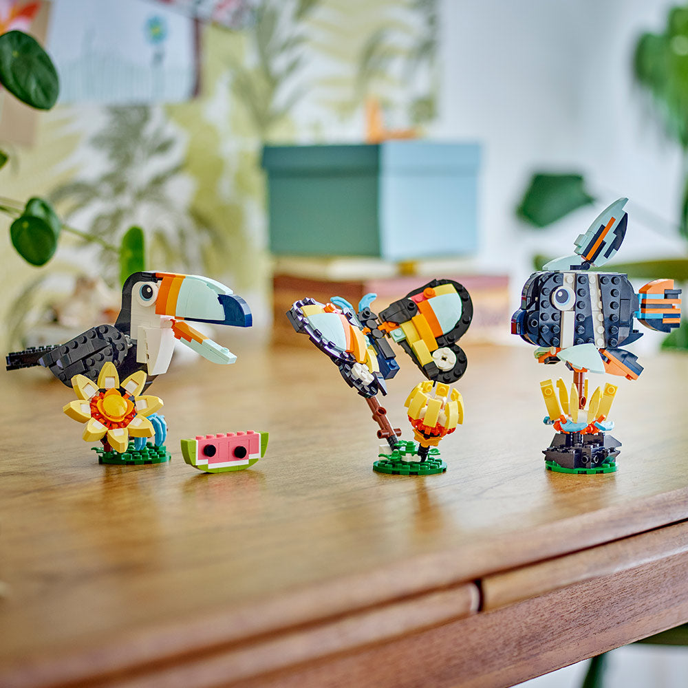 Los niños disfrutan de 3 opciones de construcción de modelos LEGO de animales con los mismos ladrillos: un tucán de juguete con una raja de sandía que puedes colocarle en el pico; una vistosa mariposa de juguete con alas articuladas que vuela sobre su base, formada por hierba y una flor; y un pez tropical de juguete con aletas articuladas que gira 360 grados en su base con motivos del fondo marino.