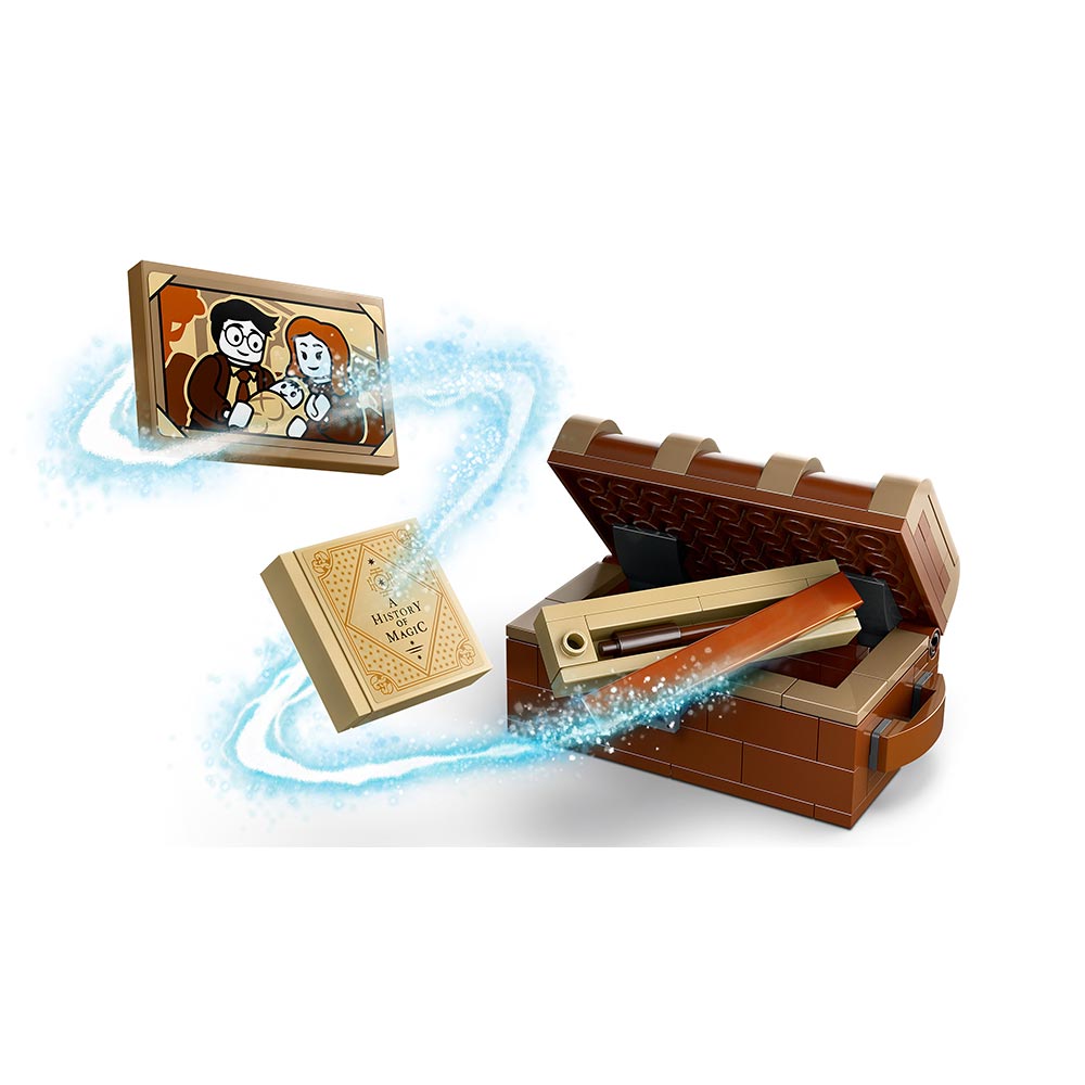 • Divertidos accesorios: El juguete incluye también un baúl construible que contiene un retrato de Harry Potter™ y sus padres, un elemento que representa un ejemplar del libro Historia de la magia y una varita para construir dentro de su estuche.