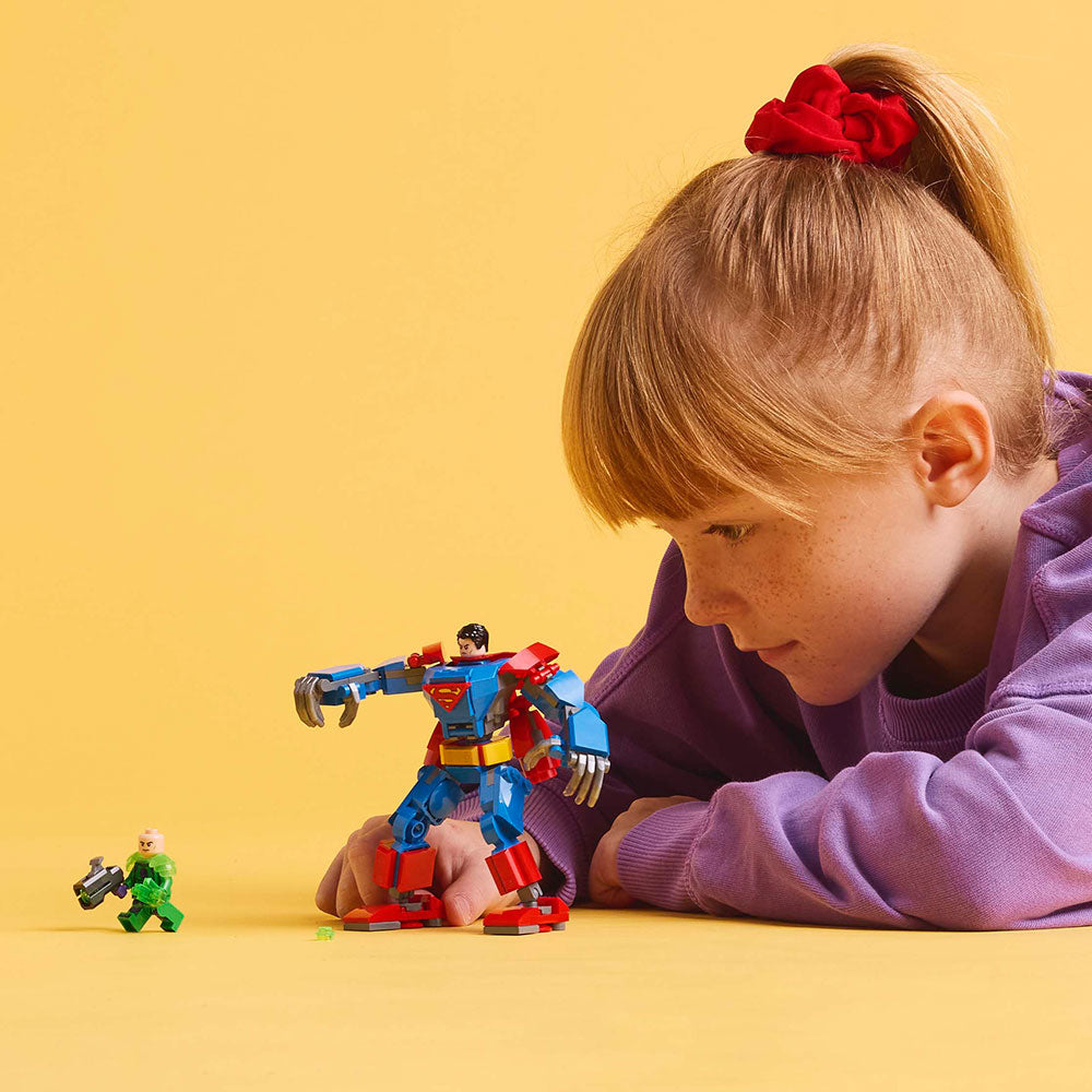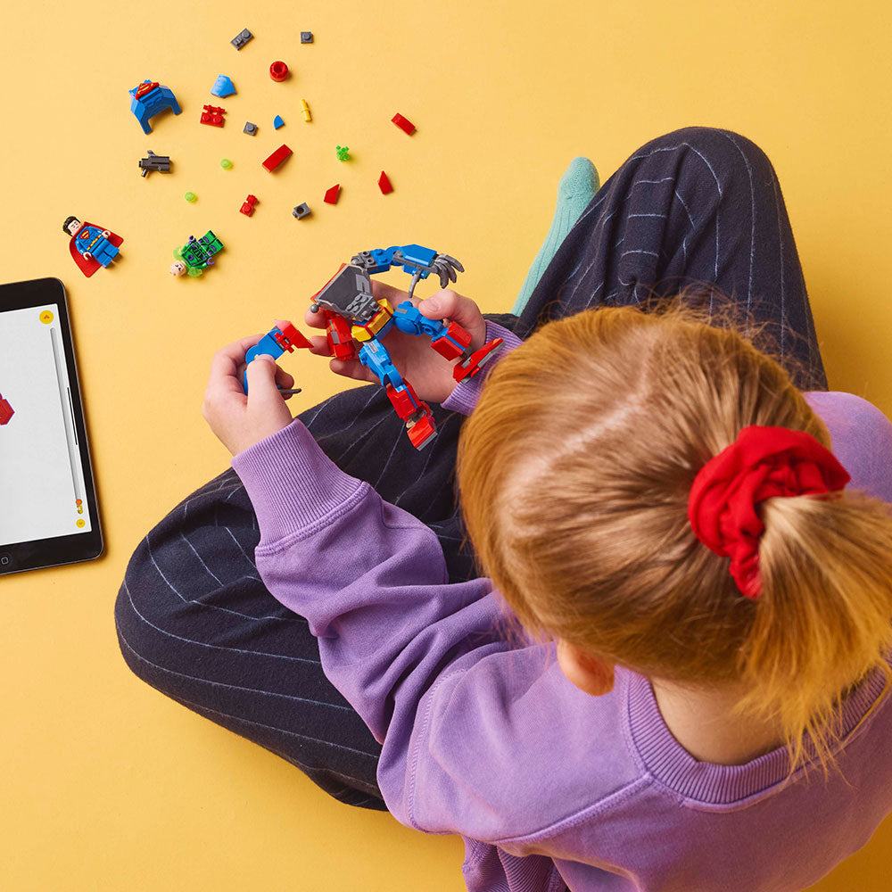Este juego LEGO DC basado en Superman incluye 2 minifiguras: Superman, con una capa de tela y una cabeza reversible con expresiones alternativas, y Lex Luthor, con un cañón que dispara y un cristal de Kriptonita. La armadura robótica construible cuenta con brazos, piernas y dedos móviles. El torso se abre y contiene una cabina con espacio para sentar a la minifigura de Superman. La armadura robótica lleva 2 propulsores ajustables en la espalda para “volar”. Para pasarlo genial también en el mundo digital, los constructores podrán desde acercar y girar versiones 3D de sus modelos hasta seguir sus progresos con la divertida e intuitiva app LEGO Builder.