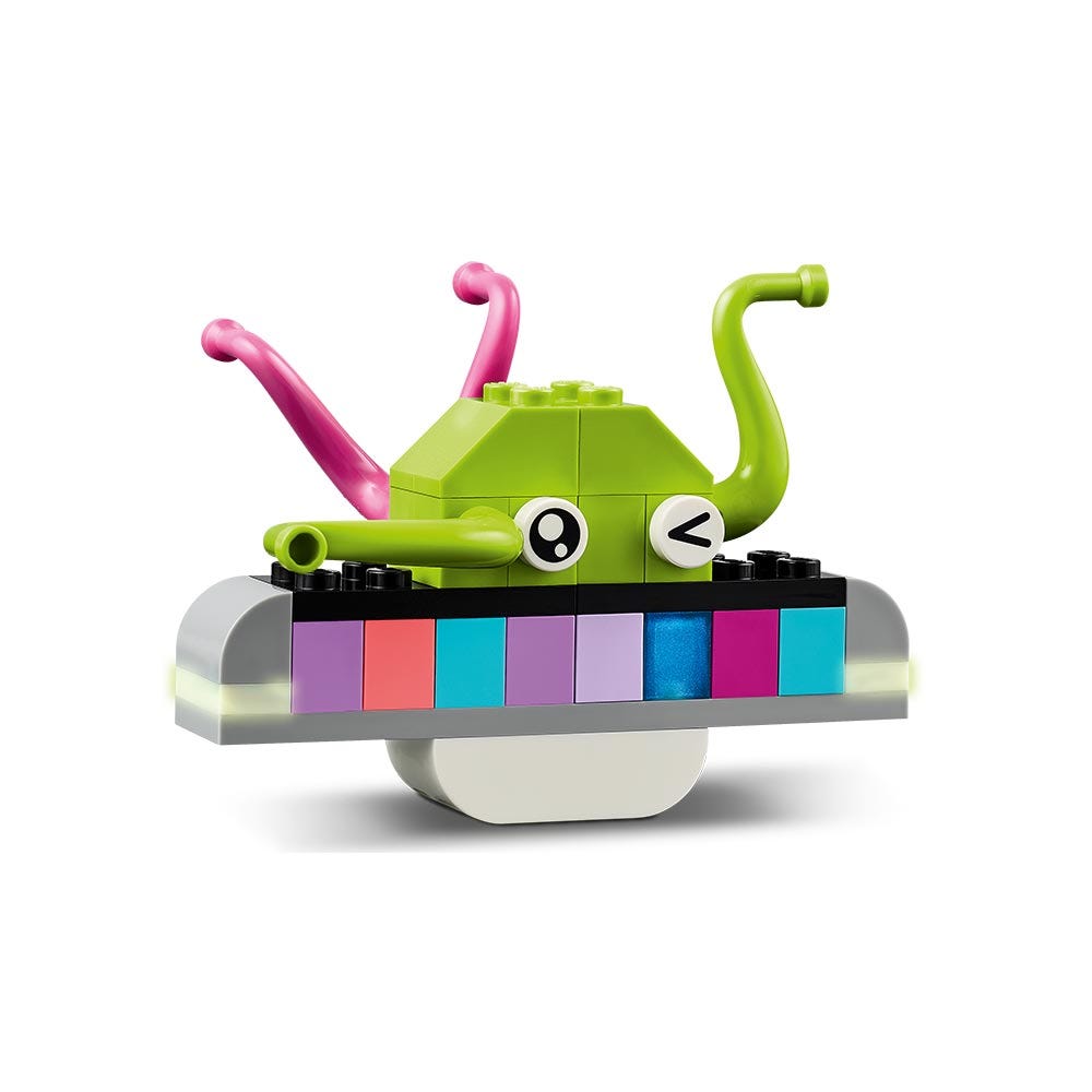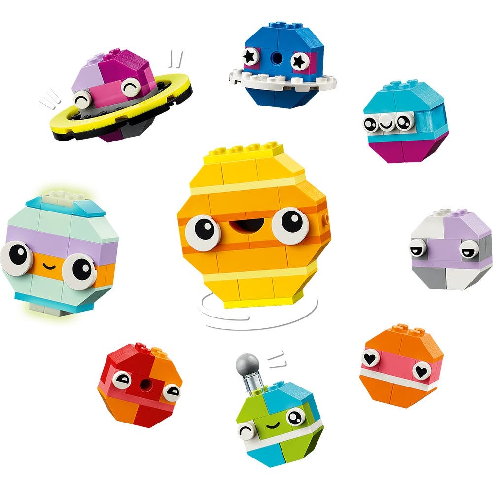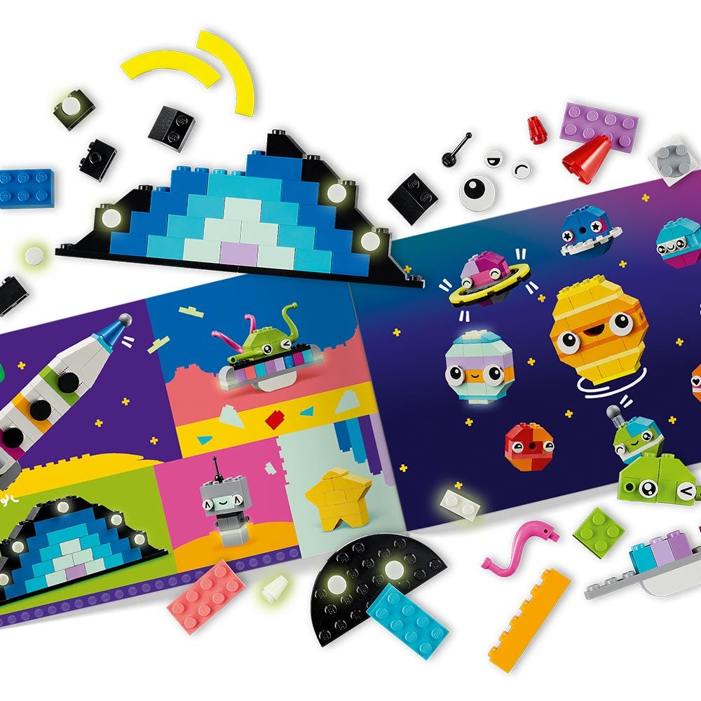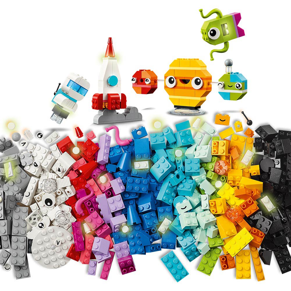 Los peques conectarán los ladrillos de colores para construir un cohete de juguete, un extraterrestre, un astronauta y un sistema solar con el Sol, Marte, la Tierra y Saturno con sus anillos. Los modelos espaciales se pueden personalizar después usando otros colores, formas, ojos o expresiones y un soporte que hace girar el modelo. Hay incluso ladrillos que brillan en la oscuridad. La creatividad cósmica continuará con las sugerencias de modelos alternativos, como un sistema solar con 8 planetas. Las instrucciones (y divertidas funciones digitales) también están disponibles en la app LEGO Builder.