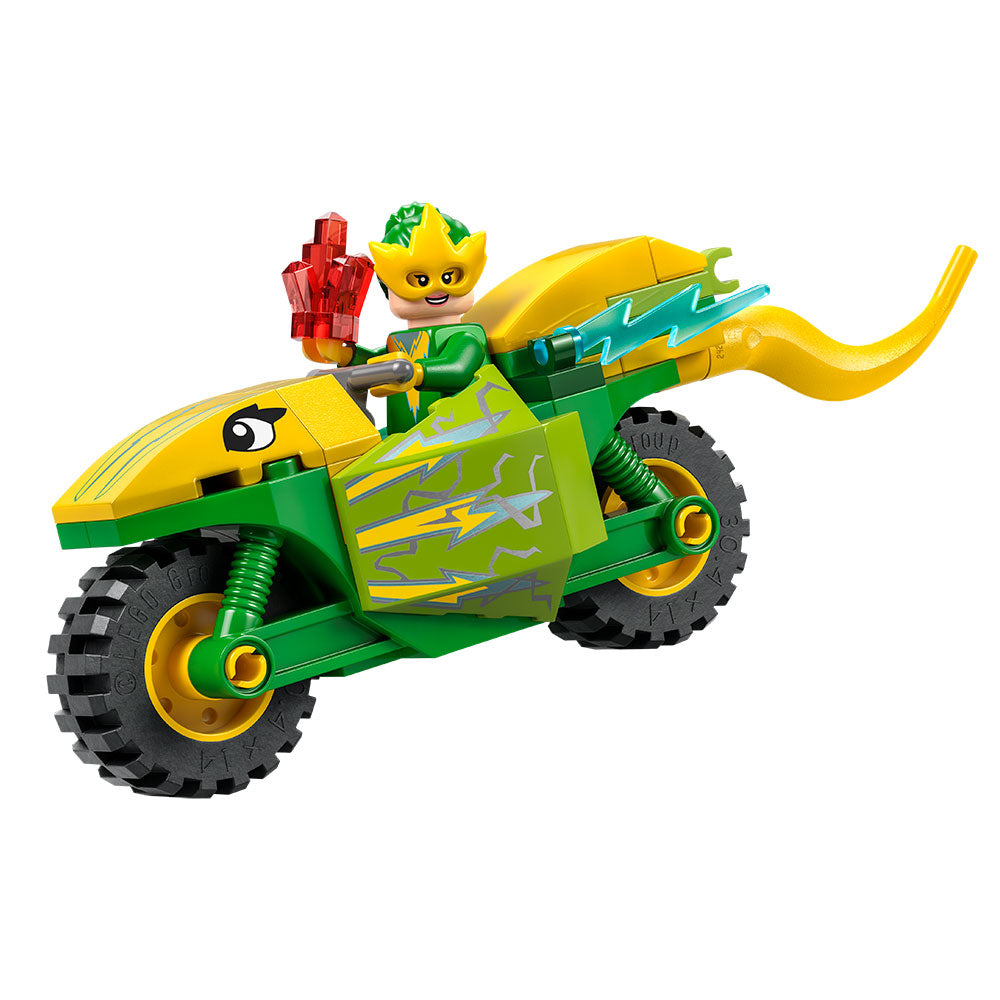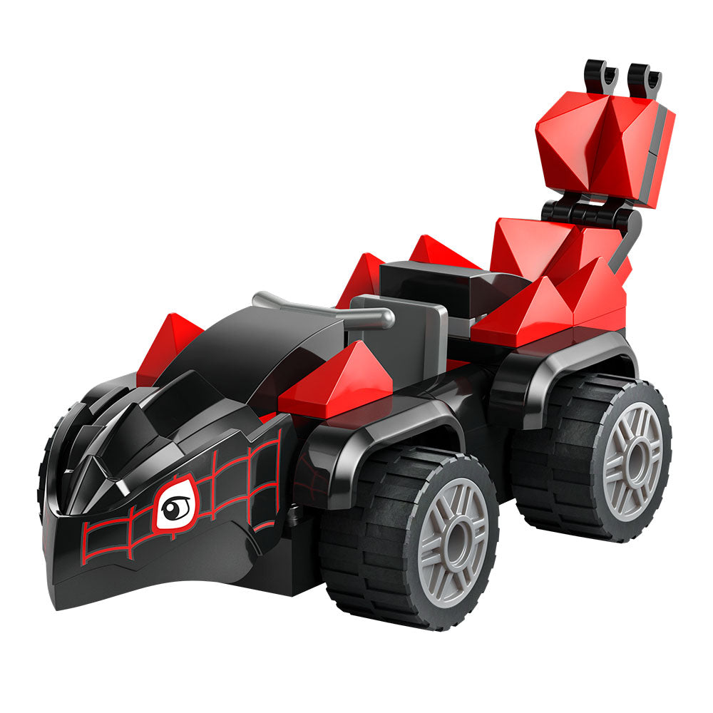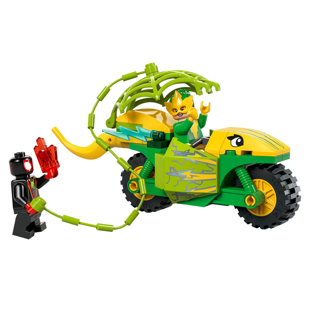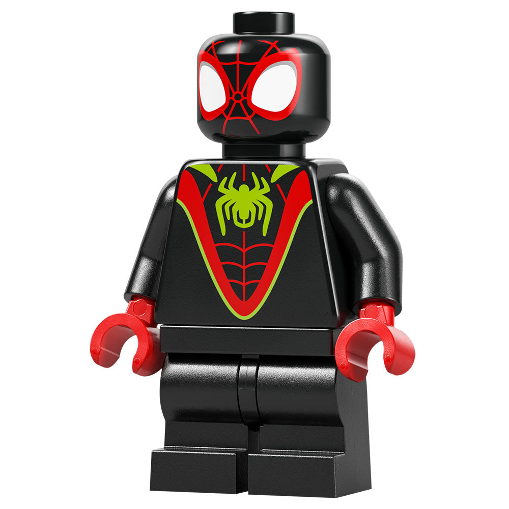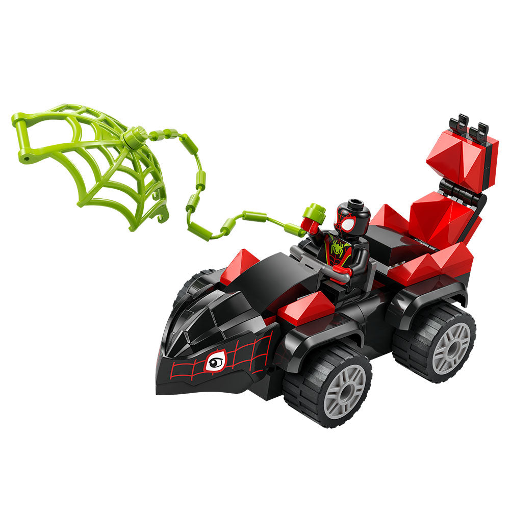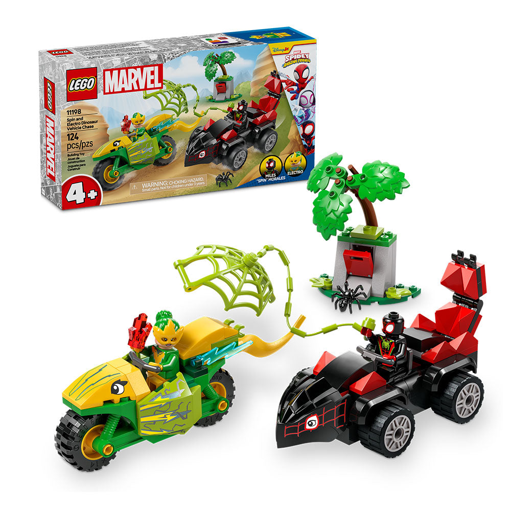 El set recrea la acción de la temporada “Dinotelarañas” de la serie para televisión Spidey y su superequipo. Viene con 2 minifiguras y 2 dinovehículos: Miles “Spin” Morales en el Auto Estegosaurio y Electro en la Moto Dilofosaurio. Una gran telaraña, un cristal oculto en una roca y accesorios que representan el paisaje pondrán en marcha el juego de interpretación creativo. Cada bolsa de la caja contiene ladrillos yun gran ladrillo para principiantes que permiten construir rápidamente el modelo y al personaje. Incluye instrucciones en forma de colorida historia visual.