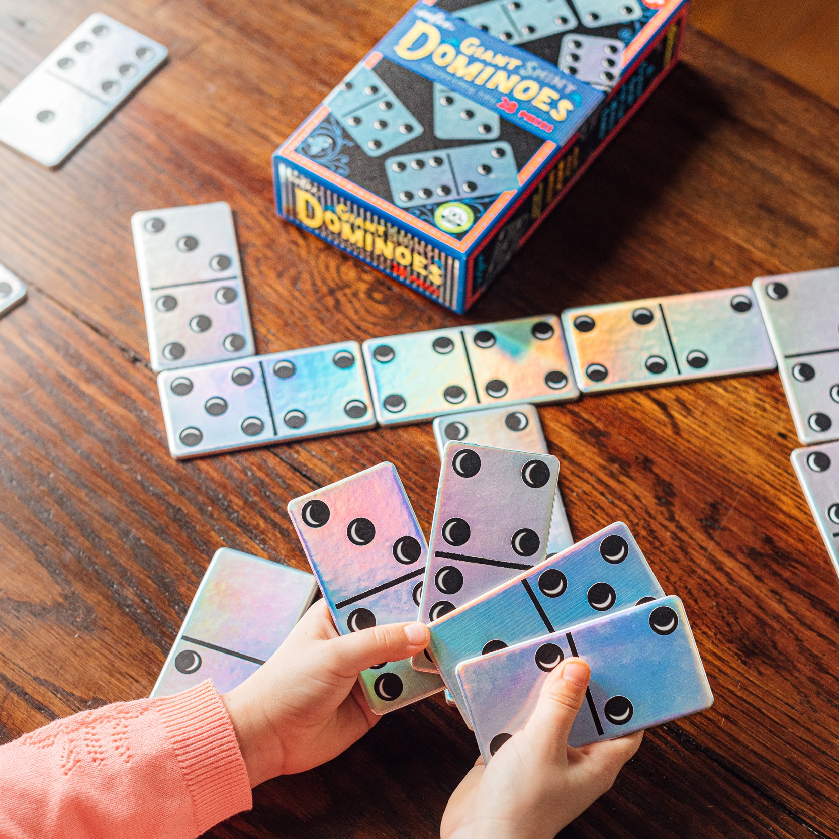 Los Dominós gigantes de Eeboo le dan un giro al clásico juego. Jugadores jóvenes y no tanto disfrutarán las piezas de juego gigantes metalizadas.