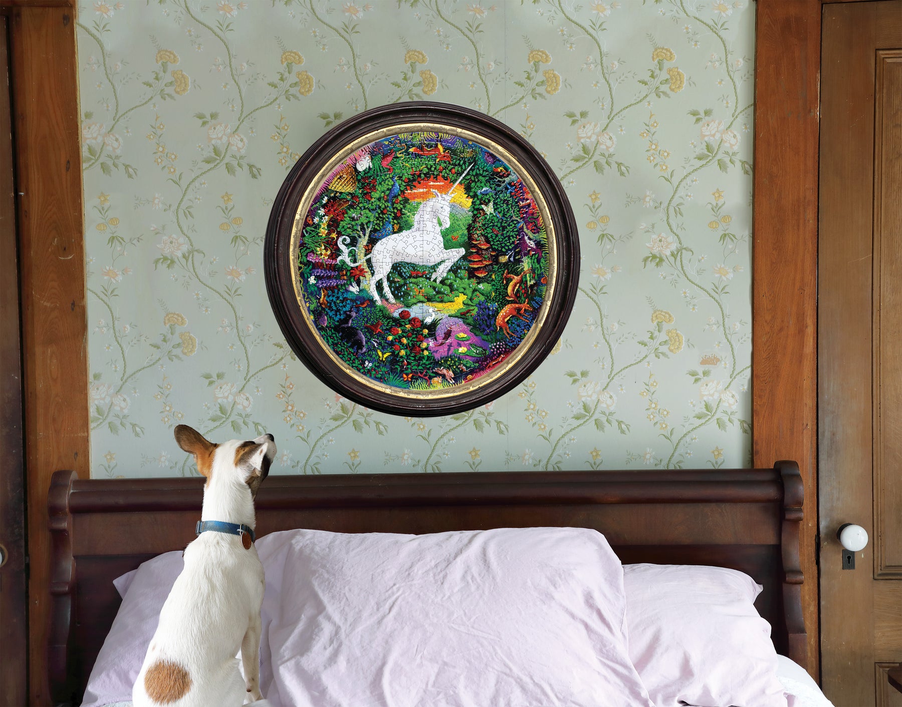 Acepta el desafío extra de un puzzle redondo! Esta intrincada escena pintada por el ilustrador Kevin Hawkes transportará a cualquier aficionado a los puzzles a un reino mágico. Un brillante atardecer ilumina a los habitantes del hogar secreto del Unicornio, puedes encontrar el pavo real cantante o vislumbrar un humilde puercoespin? Por siglos un emblema de pureza y gracia, el unicornio habita solamente en un lugar secreto y sagrado. Reúnanse alrededor y contemplen este invento fabulista, mientras la belleza de su hábitat capta su atención!
