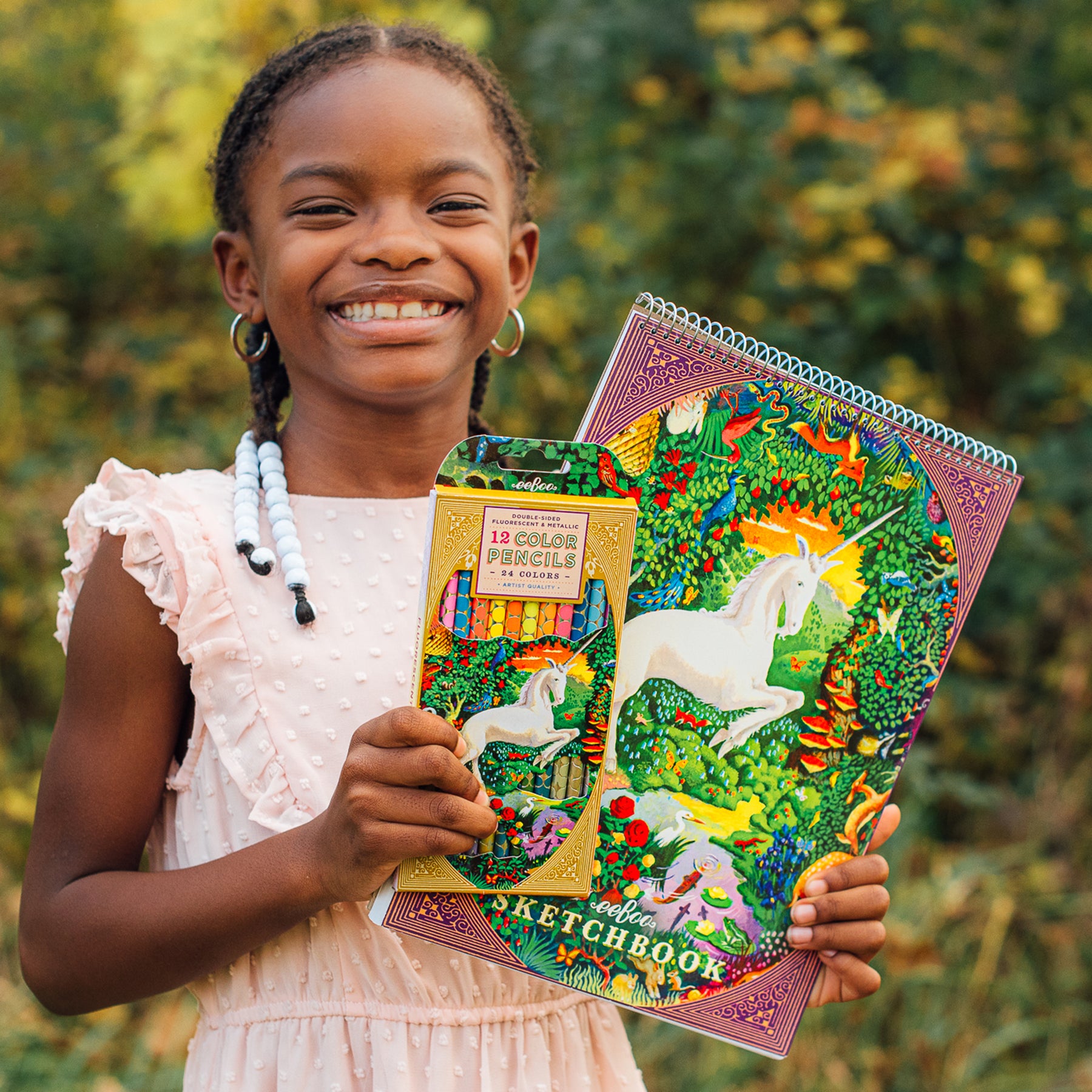 12 lápices de mina de alta calidad con vibrantes colores fluorescentes y metálicos. El color continúa de manera sólida y suave. Una lámina brillante realza los lápices en un paquete bellamente ilustrado. Un maravilloso regalo para un niño o un adulto. Combina bien con un block de bocetos a juego.
