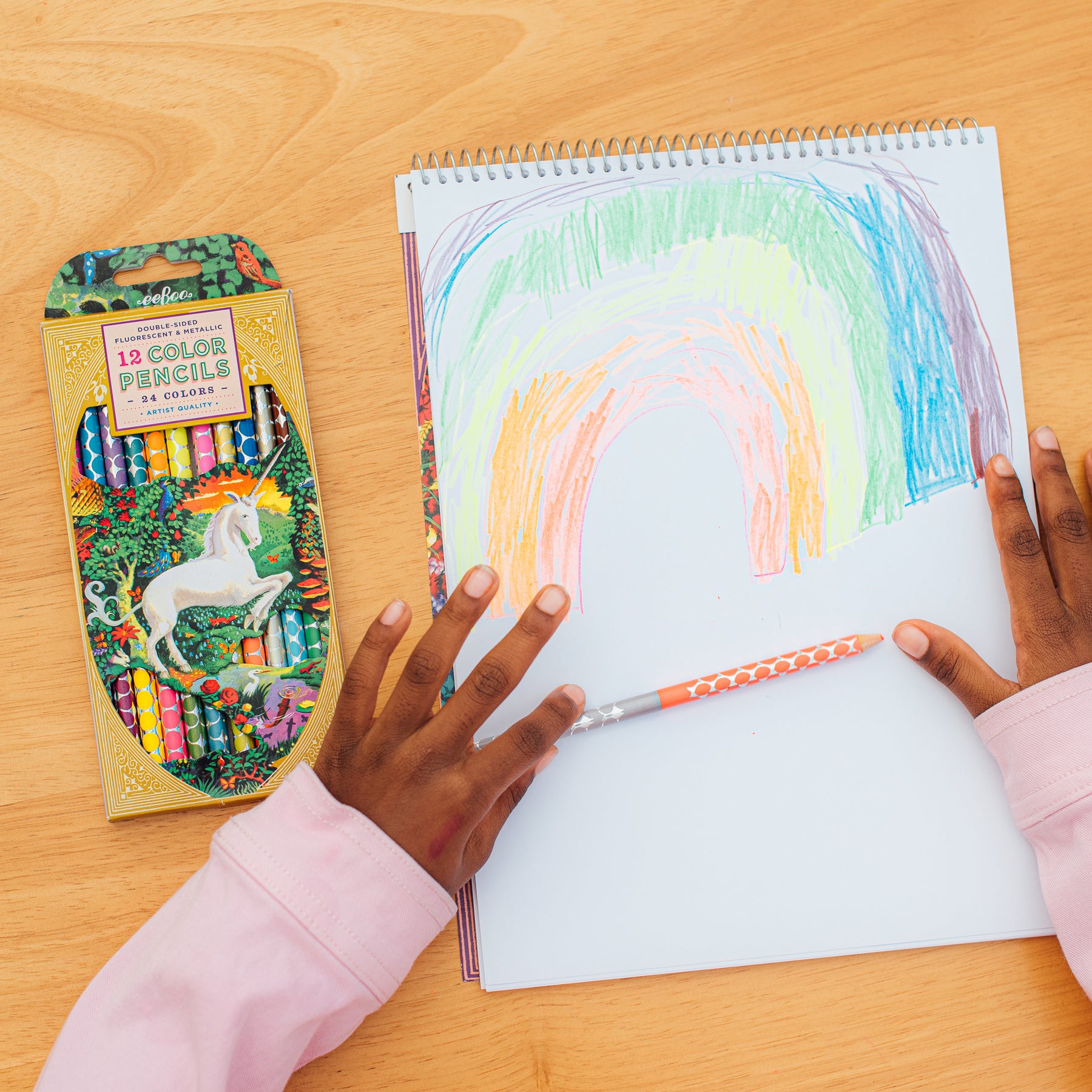 Incluye 12 lápices de colores fluorescentes y metalizados de doble cara. Cada lápiz tiene un patrón de lámina plateada brillante. Desarrolla la motricidad y fomenta la creatividad y la imaginación.